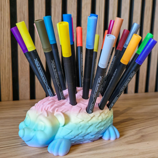 - 🦔 3D-geprinte pennenhouders – Handige én speelse opbergers voor je bureau, zoals de egel of dino pennenhouder.