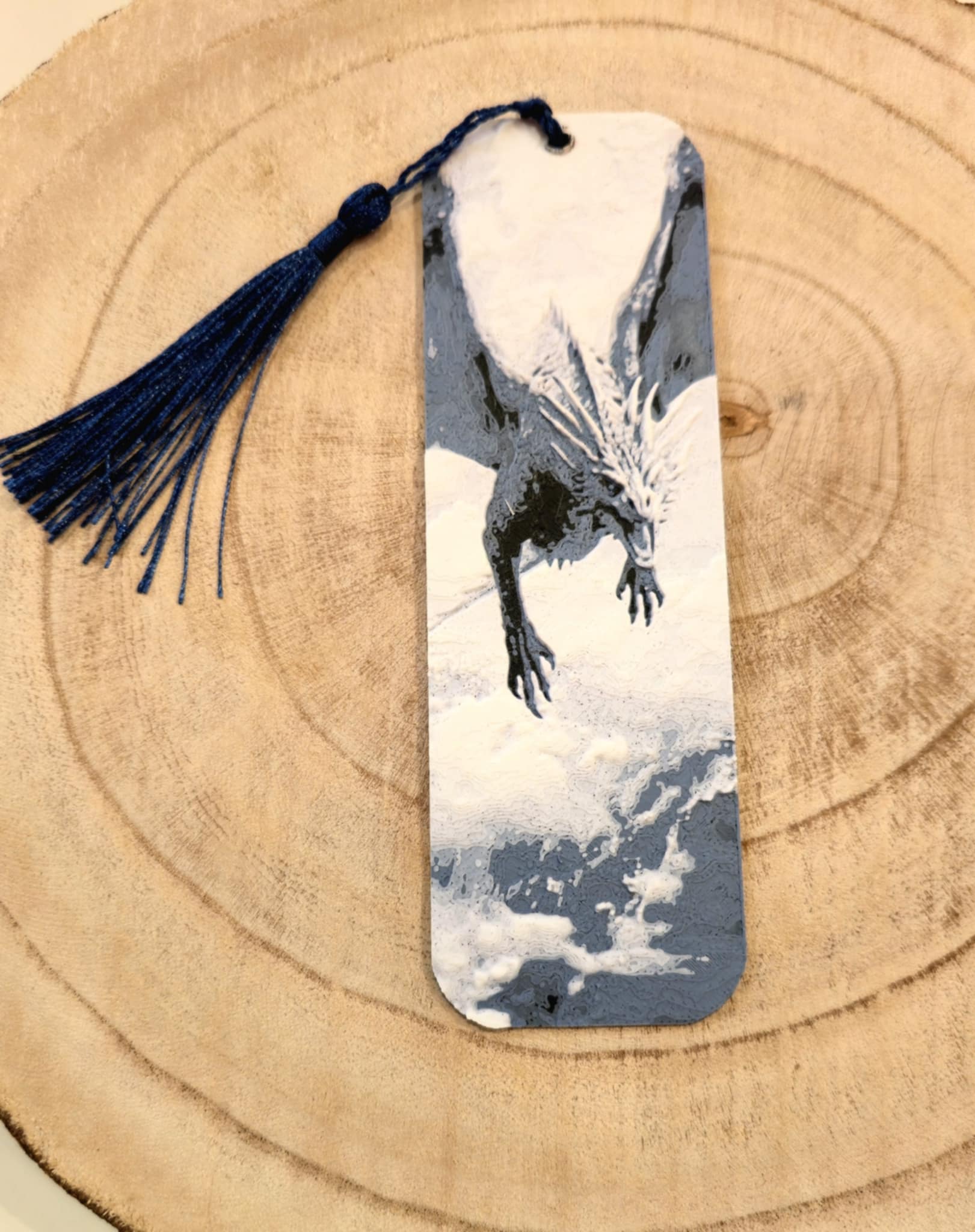 Voel de wind van het avontuur met deze bladwijzer van een vliegende draak. Afgewerkt met een kwast waarvan de kleur kan variëren.